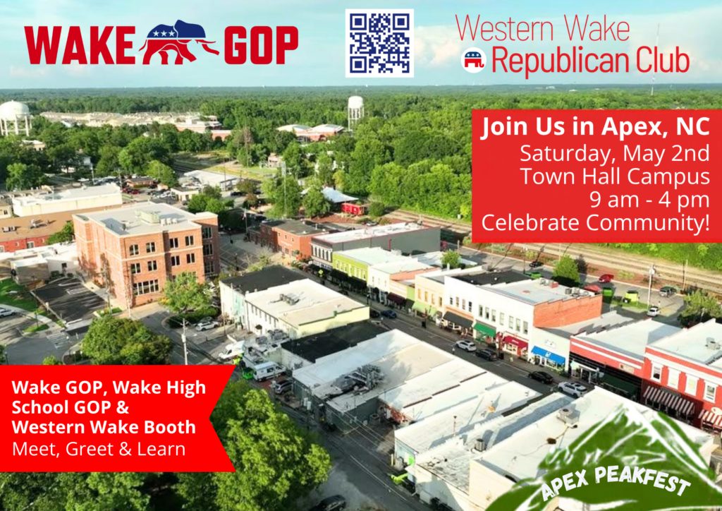 Join fellow Republicans at the 2026 Apex Peakfest, located at the Apex Town Hall Campus! Sign up here to help us to greet friends and neighbors and get out the word about our awesome candidates: https://www.signupgenius.com/go/10C0D4DAEAE2DA4FCC25-63296102-apex.